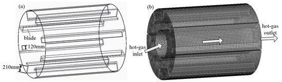 The heating drum consisted of a truncated cone section with a length of 28 cm and a cylindrical section with a length of 1970 mm and a diameter of 1508 mm. To improve the grid quality and calculation accuracy, the truncated cone section was eliminated, considering that the bituminous mixture is mainly contained in the cylindrical section, and a bituminous-mixture curtain was formed in the cylindrical section during heating. The 3D model of HDH is shown in Figure 2a. The blade was L-shaped, its height was 210 mm, and its short-side length was 120 mm. The model was simplified in the numerical simulations, and the drum model in Figure 1 was established and meshed via Gambit. The hot gas parameters were set directly at the drum inlet, and the hot blast stove, burner, fuel tank, and circulating ventilator model in Figure 1 were not established.