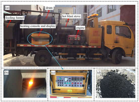 Heating test of bituminous mixture: (a) experimental equipment for heating the bituminous mixture; (b) bituminous mixture being heated in the drum; (c) heating console and temperature meter of bituminous mixture; (d) bituminous mixture after heating.