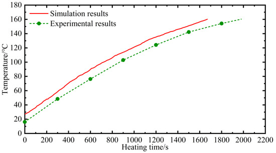 To verify the numerical model, the process of heating a bituminous mixture was simulated and experimentally researched. Simulations and experimental tests lasted until the temperature of the bituminous mixture was 160 °C. The temperature of the bituminous mixture was measured each 10 s during simulations, and the bituminous mixture temperature was recorded every 5 min by observing the display screen during the experiment. A comparison of the experimental results with the simulation results of the bituminous mixture using HDH is presented in Figure 4.