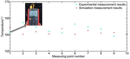 In the experiment, the bituminous mixture was discharged from the drum when the temperature reached 160 °C. The temperature was measured using a UT322 thermometer. It was impossible to selecting the same measurement points in the experiment and numerical simulations. However, the temperature at random monitoring points can truly reflect the temperature of asphalt mixtures. It is feasible to verify the reliability of the model by comparing the bituminous mixture’s temperature at random monitoring points throughout the numerical simulation and experiment. Ten random monitoring points for the bituminous mixture were selected. The experimental and simulation results are presented in Figure 5. As shown, the maximum temperature gap between the monitoring points of the bituminous mixture was approximately 4 °C, indicating that the temperature of the bituminous mixture was uniform under HDH. The temperature differences between the monitoring points of the bituminous mixture were slightly smaller in the simulation than in the experiment. Excellent agreement was observed between the simulation and experimental results.