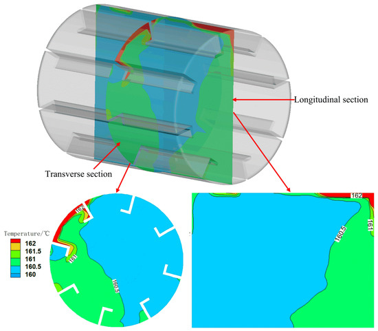 The effect of the drum rotating speed on the heating efficiency of the bituminous mixtures was examined when the speed of the hot gas was 1.36 m/s. The bituminous mixture was heated to 160 °C, and the temperature field of the bituminous mixture was analyzed at 160 °C. When the drum rotating speed is 7 rpm and the hot-gas speed is 1.36 m/s, the temperature distribution of the bituminous mixture in the drum, including the transverse cross-section and longitudinal cross-section, under HDH is depicted in Figure 6.