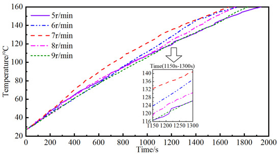 The minimum temperature of the bituminous mixture was monitored during the simulation until it reached 160 °C, and the temperature variation of the bituminous mixture at the monitoring point was determined. The temperature variations of the bituminous mixture at different drum rotating speeds are shown in Figure 7. The heating periods of the bituminous mixture for various drum rotating speeds are shown in Figure 8, under the condition of identical working parameters, and the bituminous mixture was heated to 160 °C (note that the minimum temperature of the bituminous mixture reached 160 °C).