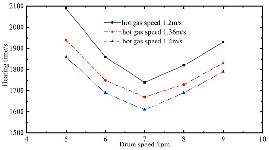 As shown in Figure 8, when the drum moved at a lower rotational speed, the heating time of the bituminous mixture was longer and the heating efficiency was lower. This trend occurred because the lifting of the bituminous mixture by the blade was too slow, and the mixture curtain sometimes disappeared when the drum moved at a low rotational speed. Additionally, the efficiency of the heat exchange between the hot gas and the bituminous mixture was significantly reduced when there was no full contact with the bituminous mixture, which resulted in a longer heating time of the bituminous mixture. Furthermore, the heating efficiency of the bituminous mixture was low when the drum rotating speed was very high. This is because part of the bituminous mixture rotated with the drum without falling. Although a mixture curtain was formed continuously, its area was small, and the heat exchange efficiency between the hot gas and bituminous mixture was low with a small contact area. Furthermore, the heating time was the shortest when the drum rotating speed is 7 rpm at hot-gas speeds of 1.2, 1.36 and 1.4 m/s.