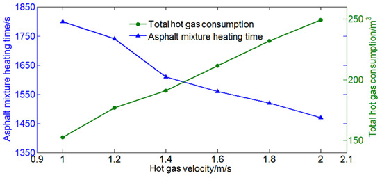 The heating period and hot-gas consumption of the bituminous mixture under HDH for different hot-gas speeds are presented in Figure 9. As shown, the hot-gas speed significantly affected the heating period of the bituminous mixture. The heating period of the bituminous mixture decreased with an increase in the hot-gas speed. A higher speed corresponded to a shorter heating time of the bituminous mixture, although the efficiency of heat utilization was reduced. Although part of the hot gas was recycled and reused after heating the bituminous mixture, some of the hot gas was lost in the heating process, and a large amount of energy was consumed. Moreover, when the hot-gas speed reached a certain value, the heating-up period of the mixture was not significantly shortened with the increase in hot-gas speed. In contrast, at a high hot-gas speed, the heating-up period of the bituminous mixture was short, but the hot-gas consumption increased, and more energy was wasted. The above analysis indicates that the hot-gas speed should neither be very low nor very high. When the hot-gas speed was increased from 1.2 to 1.4 m/s, the heating-up period of the bituminous mixture was significantly shortened, and the hot-gas consumption increased slightly. Therefore, it is suitable to set the hot-gas speed to 1.4 m/s.