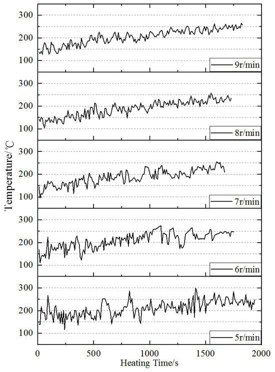 As shown in Figure 7, there were several “small steps” in the temperature curve of the bituminous mixture when the drum rotating speed was 5 rpm. These “steps” indicate that the temperature rise of the bituminous mixture was sometimes rapid or slow because of the intermittent formation of a mixture curtain. The temperature of the bituminous mixture increased rapidly when the curtain was fully formed but increased slowly when the curtain was not completely formed or not formed at all. The temperature curve of the bituminous mixture was relatively stable, and there were hardly any “small steps” in the curve when the drum rotating speed was 7, 8 and 9 rpm because the mixture curtain was stable at higher drum rotating speeds.