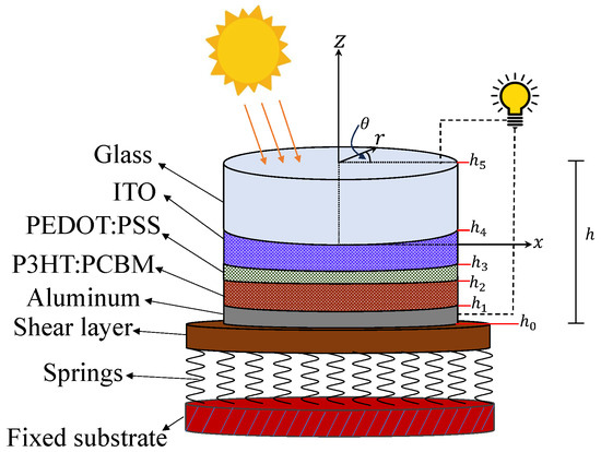 The inquiry model used in this work is composed of five distinct material layers, each with the same radius R and total thickness h, which are Al, P3HT:PCBM, PEDOT:PSS, ITO, and Glass. Additionally, two elastic foundation layers (Winkler and shear layers) support the cells (see, Figure 1). In the Cartesian coordinate system, Shimpi’s plate theory is established based on a number of assumptions [17]. It is clear that the suppositions are also suitable to use in the circular coordinate system taking into consideration that the components of the displacement field in the r, , and z directions are (), respectively. Thus, it follows that [17]
