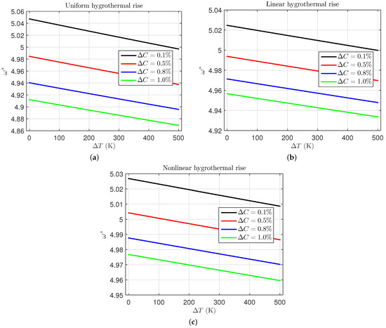 To explain the influences of the uniform, linear, and nonlinear temperature and moisture changes () on the fundamental frequency in graphical form, Figure 2 is presented (). Since the increment in the humidity and temperature leads to a weakening of structures, the frequency of the circular organic solar cells decreases as the temperature and moisture increase.