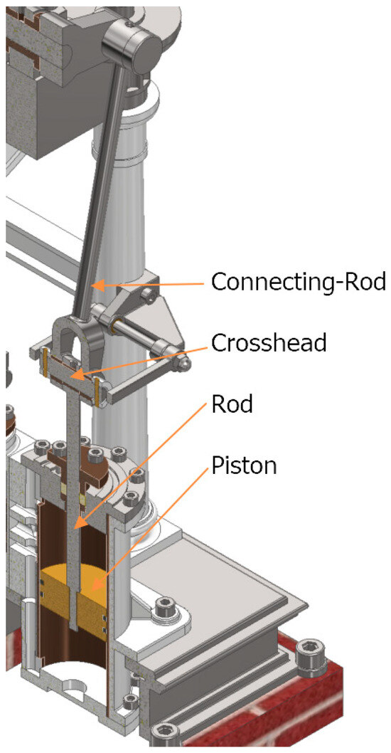To ensure that the movements of the pistons are opposite and symmetrical, there is a crosshead that is attached to the piston through a rod (Figure 8). This crosshead helps guide the movement of the piston and prevents it from rotating, preventing the transverse forces transmitted by the connecting-rod to the piston (the connecting-rod extends from the crosshead to the crankshaft) from generating excessive lateral thrust in the cylinder. Thus, the parallel movement crosshead mechanism is key to maintaining the smooth and efficient operation of the machine as it guides the piston in a straight line and prevents excessive wear of the components.