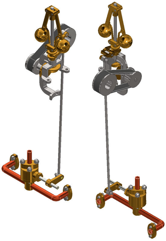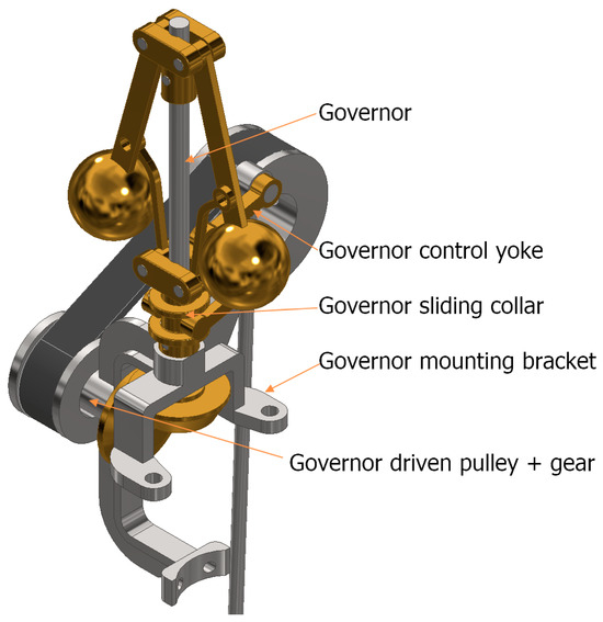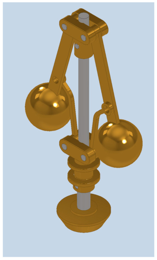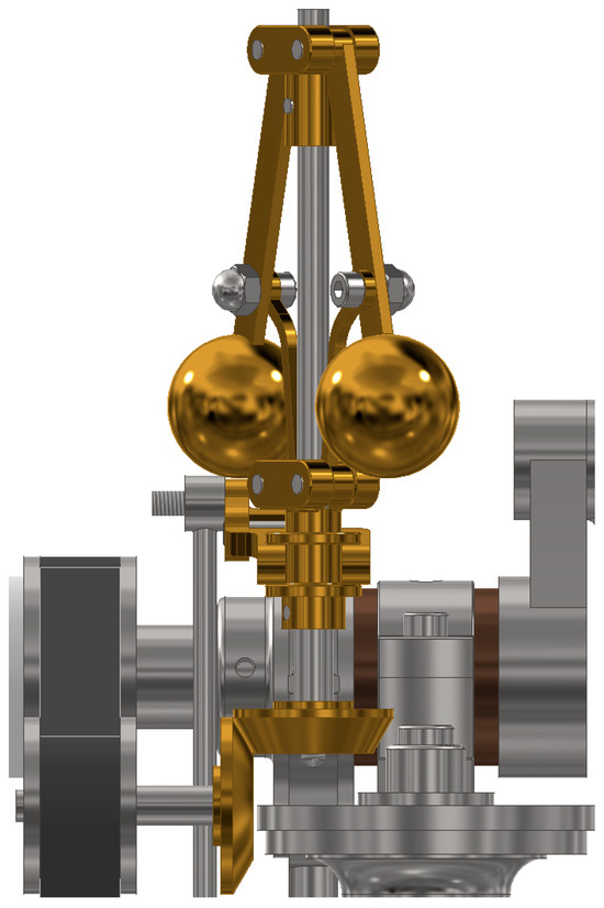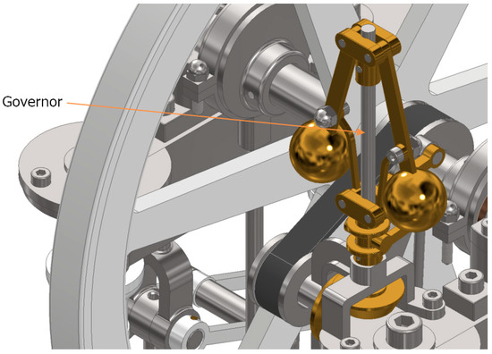 The parallel motion link is a mechanical part that connects the crosshead to the crankshaft (Figure 9), and its purpose is to maintain the linear motion of the piston while allowing the crankshaft to rotate, placing it in the symmetrical part of the steam engine with respect to a plane of central symmetry. As the steam expands and forces the piston to move back and forth, the connecting rod transmits this motion to the crankshaft through the parallel motion mechanism. For its part, the crankshaft converts the reciprocating motion into rotary motion to drive the flywheel, rotating in solidarity with a drive belt, linked in turn to a speed governor (Figure 10) using bevel gears (Figure 11). This movement will depend on the amount of air allowed to enter, which will make the movement of both elements (governor and drive belt) faster (more air entering) or slower (less air entering). All this will be controlled with the throttle valve, which will be explained later.
