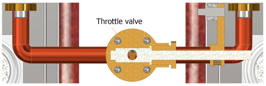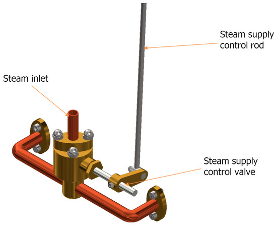 Hence, in addition to reducing the crankshaft speed, the steam inlet flow rate is adjusted by varying the cross section in the direction of flow. Moreover, when steam enters the machine through the steam inlet pipe, it encounters a steam supply control valve that works like a throttle valve (Figure 15), since it has a through hole that can be adjusted depending on the desired steam flow. This also reduces the linear speed with which the slide valve moves inside the valve chest and consequently also the linear speed of the piston inside the cylinder, making the machine work more slowly.