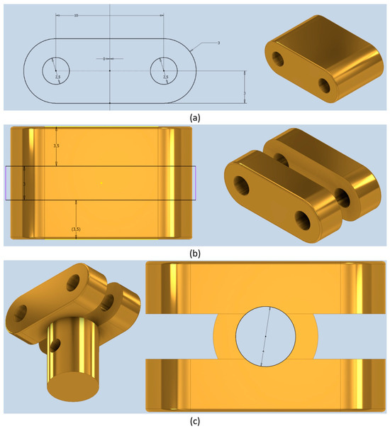 Design of the upper flyweight arm support: (a) first step: sketch and extrude operation, (b) second step: sketch and removal operation and (c) third step: sketch and removal operation.