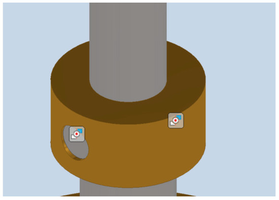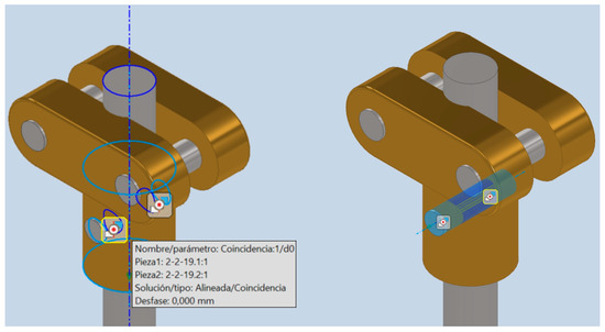 The next step will be to carry out the subassembly of this part of the speed governor, which will be assembled to another subassembly that will be carried out later. The upper flyweight arm supports will be assembled to the governor vertical spindle, thanks to two pins (Figure 23) and two concentric-type coincidence constraints (Figure 24).