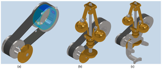 Therefore, all the previous elements can now be assembled, resulting in the second subassembly related to the drive belt (Figure 36a). In this figure, we can see the existence of a new constraint symbol (tangency), since it has been necessary to indicate that the internal face of the drive belt is at a tangent to the central cylindrical body of the two governor drive pulleys. The drive belt has two different diameters, which must be assembled with their respective drive pulleys using the concentricity constraint.