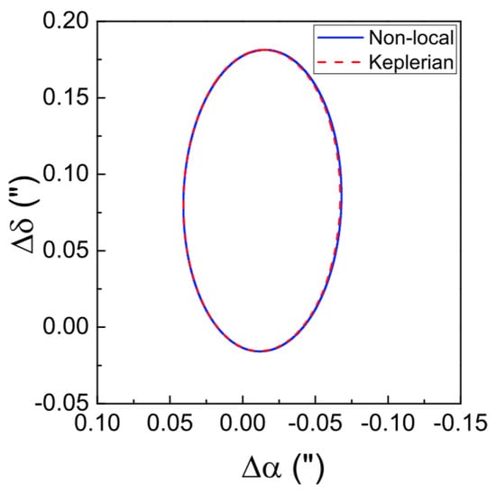 The plot in the Figure contrasts the Keplerian orbit with the non-local orbit. The red dashed line accounts for the Keplerian orbit, whereas the blue solid line represents the orbit derived from the non-local theory. The parameters utilized correspond to those yielding the minimum value, while and denote the coordinates of the S2 star.