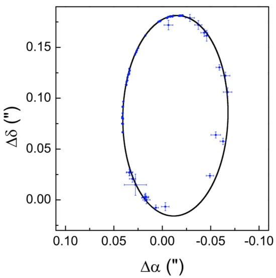 The plot in the Figure displays the most optimal non-local gravity orbit, characterized by parameters and that minimize the value, with and denoting the coordinates of the S2 star.