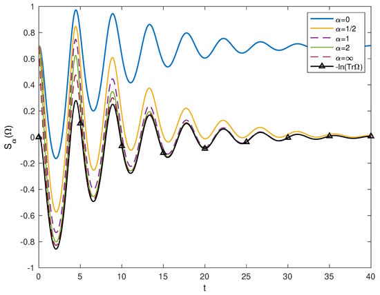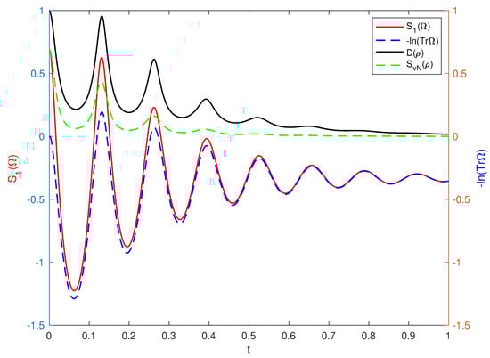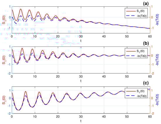where , and  are normalized density matrices. We notice that the only difference between the expressions of  and  is the use of . Investigation of  is enough for our purpose, as the dynamics of NH quantum Rényi entropy for different values of  are similar [,]. Boltzmann’s entropy formula and Shannon’s entropy formula state the logarithmic connection between entropy and probability. We borrow this wisdom and take the natural logarithm of . We find that  can serve as a new description for the information dynamics in NH systems, as it is found to be synchronous and correlated with NH quantum Rényi entropy. The function  captures the essence of the information dynamics in NH systems, as we show in Figure 1.