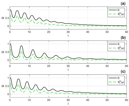 The black line represents distinguishability D; the dashed green line represents , i.e., the von Neumann entropy. The variable . (a) , ; all parameters are the same as in Figure 3a; (b) , ; all parameters are the same as in Figure 3c; (c) , ; all parameters are the same as in Figure 3b. While  and  show that there are three information dynamics patterns for anyonic-PT symmetric systems—damped oscillation with an overall decrease (increase) and asymptotically stable damped oscillation—the three patterns are distorted by D and  and are degenerate to the same pattern, as we show here. We see that the distortion is related to the lower bounds of D and  being zero.