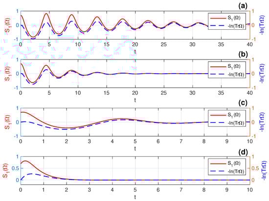 Here comes the problem that  can be negative, and the comparison above in Figure 4 gives a phenomenological justification for the necessity of it. We go one step further and discuss the negative entropy in NH open quantum system. Entropy measures the degree of uncertainty. In the sense of a classical statistical mixture, a closed system with complete certainty is possible, and thus, it is reasonable that the lower bound of the von Neumann entropy is zero. However, a general open quantum system cannot possess complete certainty since it constantly interacts with its external environment in a unpredictable way. Therefore, if we take the entropy of closed systems as reference, it is natural that for open quantum systems, entropy might be negative. For example, unique properties of PT symmetric systems are always predicted and observed in classical or quantum systems where gain and loss of energy or amplitude are balanced. Then, we can reasonably expect that different magnitudes of the balanced gain and loss will lead to different lower bounds of entropy. Negative entropy is possible and important in Hermitian physics too. It is well known that quantum information theory has peculiar properties that cannot be found in its classical counterpart. For example, an observer’s uncertainty about a system, if measured by von Neumann conditional entropy, can become negative [,,]. With the density matrix of the combined system of A and B being  (), von Neumann conditional entropy is defined as
