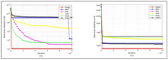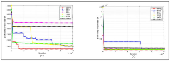 In order to evaluate the convergence of ODBO, a number of algorithms were selected to compare with ODBO, namely, the DBO algorithm, HHO [24] algorithm, SSA algorithm, WOA algorithm [25], and SABO algorithm [26]. Figure 1 and Figure 2 illustrate their operation on F1, F7, F20, and F25 of CEC2017, from which it can be seen that among the six algorithms, ODBO achieved the fastest convergence on F1, F7, and F25, and slightly slower than SABO on F20; however, ODBO always found the optimum in the shortest number of iterations, and the optimum was much smaller than the other five compared algorithms. It is also worth mentioning that ODBO converged fast in the preliminaries. Comparatively, DBO tends to require many iterations to converge and exhibits poor pre-exploration capabilities.