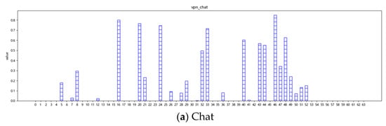 From Figure 7, it can be observed that the positional interval (100, 200) exhibits the maximum dispersion, indicating that the model’s attention divergence towards different traffic types is highest within this interval. Therefore, we extracted the weights of the first 64 positions from this interval. As shown in Figure 8 and Figure 9, these extracted weights were normalized and plotted in bar charts. The bar charts highlight the disparity in attention levels for different byte positions across various traffic types. As evident from Figure 8 and Figure 9, the attention weight values of different traffic types at the same position differ. For example, in Figure 8, the attention positions for chat and email traffic are quite similar, with minimal byte attention within the interval (100, 125). P2p traffic exhibits the maximum byte attention within this interval, indicating its significant impact compared to other traffic types. In Figure 9, it can be observed that the attention weight values for VPN-encrypted traffic are much higher compared to non-VPN-encrypted traffic, indicating a significant disparity between the two, thereby explaining the factors contributing to the substantial differences in the spectra of non-VPN-encrypted and VPN-encrypted traffic.