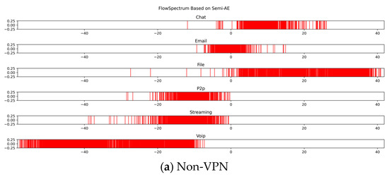 Our objective is to analyze the characteristics of different types of network traffic on the FlowSpectrum and to interpret the differences in spectral ranges among various network traffic. Initially, we employ the AMAE model to generate FlowSpectrum for VPN-encrypted traffic and non-VPN-encrypted traffic. As illustrated in Figure 5, the spectral characteristics of non-VPN-encrypted traffic and VPN-encrypted traffic generated based on the AMAE model in this study are, respectively, presented. From Figure 5, it can be observed that different types of traffic correspond to different intervals on the FlowSpectrum. For instance, in non-VPN-encrypted traffic, the spectral range of chat flows mostly lies within the interval (−15, −30), while (−20, −60) is the interval where email traffic is predominantly distributed. In VPN-encrypted traffic, the spectral range of chat traffic mostly falls within the interval (10, 30), while (0, −10) is the distribution interval for email traffic. Figure 5 effectively demonstrates VPN-encrypted flows and non-VPN-encrypted flows in a one-dimensional coordinate system. Moreover, by identifying the interval ranges, the distinguishing features of different types of encrypted traffic can be clearly discerned.