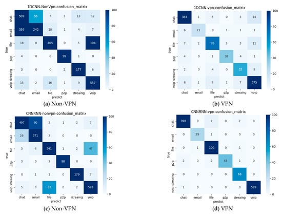 Classification confusion matrix for encrypted traffic of VPN and non-VPN based on four types of comparison models.