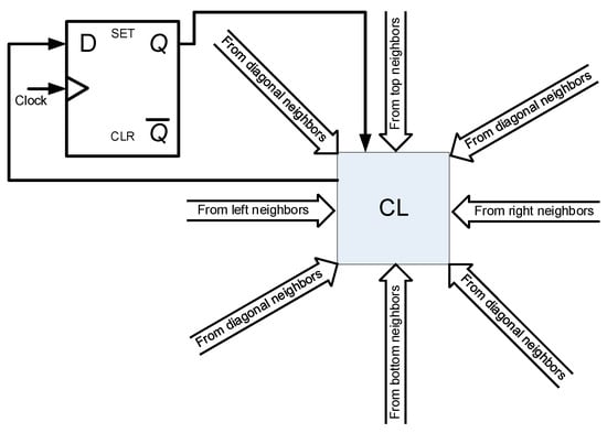 The CA evolve at discrete time steps, and the next state of each cell that is part of the CA depends only on its current state and on the states of its neighbors. As a result, each cell is based on a storage circuit (for example, a D flip-flop) and a combinational logic circuit (CL) that set the evolution functions of the next state of the cell. A general image of a cell that includes different models of neighborhood interactions is shown in Figure 3.