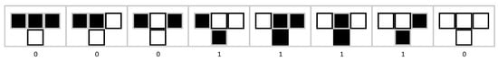 - Land, M.; Belew, R.K. No Perfect Two-State Cellular Automata for Density Classification Exists. Phys. Rev. Let. 1995, 74, 5148–5150. [Google Scholar] [CrossRef]