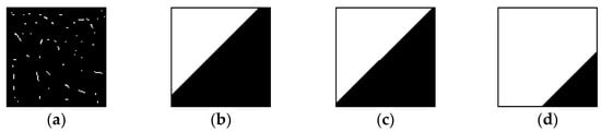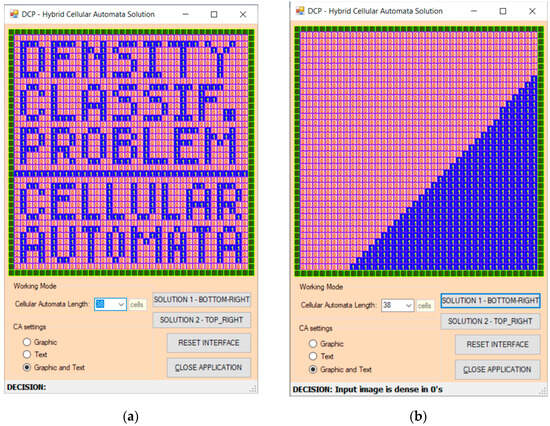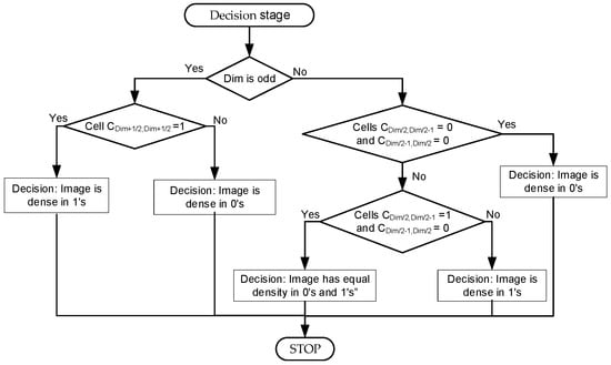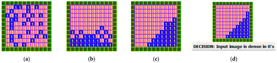 Figure 14b–d show the output images produced by the two-dimensional CA algorithm assuming an initial CA of size 10. In Figure 14d, at the decision stage, because the values of the two cells located in the center of the secondary diagonal matrix data structure are “00”, the conclusion is that the image is dense in 0′s.