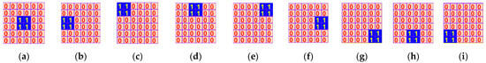(a) Initial image of the CA; (b) The effect of the applying of evolution rule 2; (c) The effect of the applying of evolution rule 4; (d) The effect of the applying of evolution rule 8; (e) The effect of the applying of evolution rule 16; (f) The effect of the applying of evolution rule 32; (g) The effect of the applying of evolution rule 64; (h) The effect of the applying of evolution rule 128; (i) The effect of the applying of evolution rule 256.