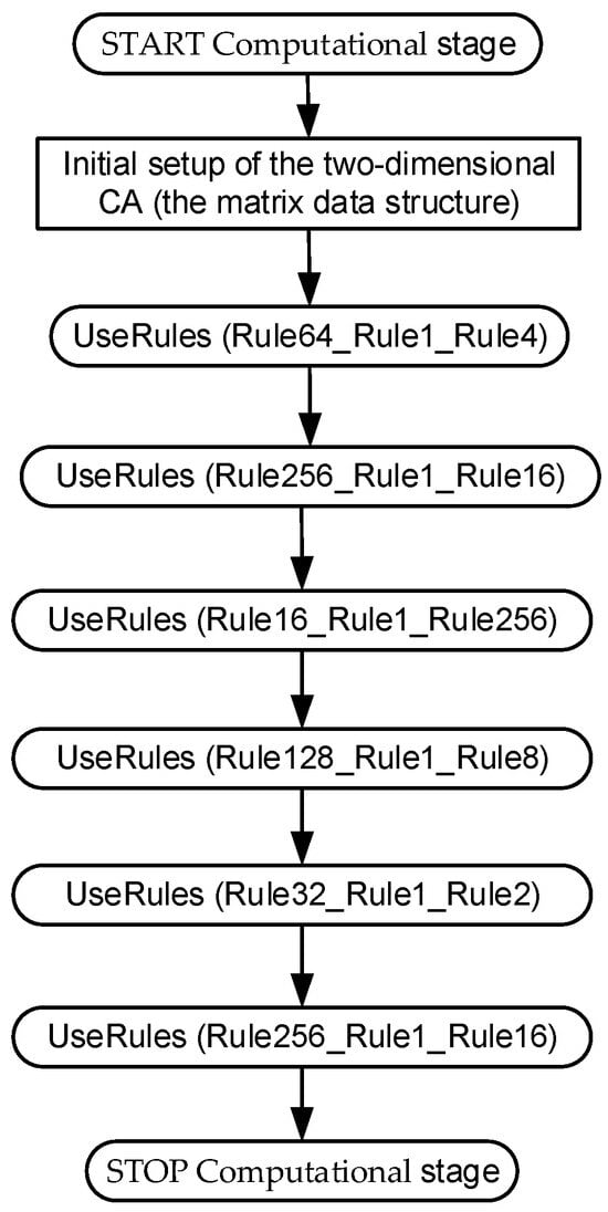In Figure 8, CCADCs stands for “Central Cell and Diagonal Cells”, and the UseRules (Rule64_Rule1_Rule4) block means that each CA central cell (position (i, j) in the lattice) has two neighbors on the diagonal. One neighbor is localized at position (i−1, j−1) in the matrix, and the other is localized at position (i+1, j+1) in the matrix. If we apply the combination of rules 64, 1, and 4 to all the cells of the CA, using the logic described in Figure 8, all values of 1 will be translated to the bottom-right direction. If the value of the cells at the boundary in the direction of translation is zero, in this case the last row or column of the CA cells, then only rule 64 is applied. Otherwise, the cells remain in their previous state—this is equivalent to applying rule 1 to the cell. Therefore, rule 1 can be used for density conserving, and the other two rules, in this case rule 64 and rule 4, can be used to move the 1′s values to the bottom-right direction in the matrix.