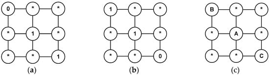 It is obvious that, for marginal cells of the CA, for example in the case of the one-dimensional CA, cells C1 and Cn, the evolution function f presented in Equations (1)–(5) cannot be applied directly because there are no other neighbors at the end of the lattice. For this reason, different boundary conditions will be applied there. Some boundary conditions variants in the case of one-dimensional CA with radius 1 are presented below.