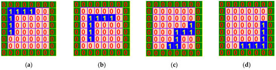 The DCP method introduced here operates on the premise that in this problem the primary aim is to construct or discover a binary two-dimensional hybrid CA capable of categorizing the density of 1 s and 0 s within the initial lattice configuration. Under this approach, if the initial lattice has a higher density of 1 s than 0 s, the CA is expected to transition towards a final state containing only 1 s after a transition phase. Conversely, if the initial configuration tends towards a higher density of 0 s, the CA should converge to a null configuration consisting only of 0 s. So, in such scenarios, the evolution of the CA predominantly depends on the initial state, and, after applying the evolution rules, the initial image undergoes a translation across the lattice. It is imperative to ensure that the density conserving condition is also satisfied during this process. The fulfilment of these two conditions, translation of the information across the lattice, e.g., towards the bottom right, and density conserving, can be graphically visualized in Figure 6.