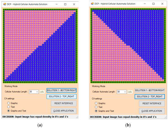 (a) Final image of the CA with random initial image and decision for the bottom-right solution; (b) Final image of the CA with the same initial image as in case (a) and decision for the top-right solution.