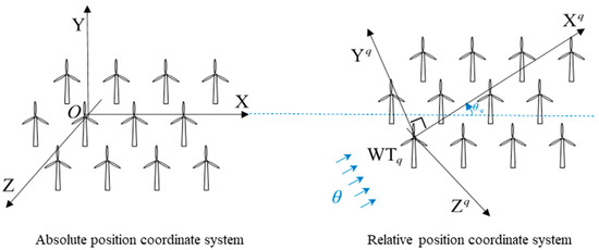Under the wind direction , a new right-handed coordinate system was established. The hub height center of is taken as the coordinate origin, the downwind direction is designated as the positive direction of axis, and the axis is designated as a rotation of 90° counterclockwise perpendicular to the downwind direction. The coordinate system of the wind farm was called the relative position coordinate system marked as .
