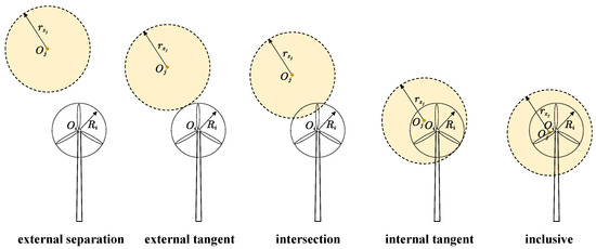 We consider the reliability of the wind farm under a single wind speed and single wind direction. The wind speed is 12 m/s, the wind direction is 0°. The relation between WTs is shown in the first subfigure in Figure 8. The rotor circles and wake circles of WT2, WT7, and WT9 are all concentric circles.