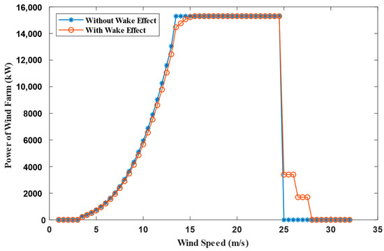 When the wind speed reaches , the upwind reaches , while the downwind affected by the wake has not yet reached . As the wind speed continues to increase, all the downwind reach , there is no difference in the power generated by the wind farm with or without considering wake effect. As the wind speed continues to increase, the downwind under the influence of the wake can still reach above , and those downwind can also generate at its rated power.