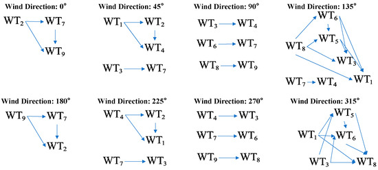 There are significant differences in the power of the wind farm in different wind directions. Under the eight wind directions, the power of the wind farm in descending order is 90° = 270° > 315° ≈ 180° > 135° > 0° > 45° ≈ 225°. The wake influence between wind turbines varies in different wind directions, as shown in Figure 8. Wind farms with similar wake influences have similar power.