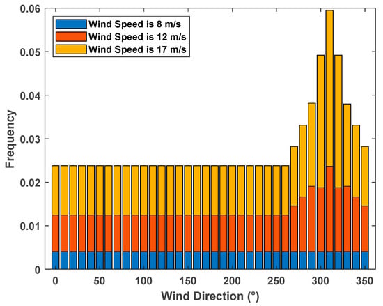 We consider the annual power generation of a wind farm under multiple wind directions and multiple wind speeds, which is a classical wind distribution used in [30,31,32,33,34]. The wind speeds are 8 m/s, 12 m/s and 17 m/s, the wind direction is in the range of 0° to 360° with intervals of 10°, and the frequency of each wind speed and direction are shown in Figure 9. The other environmental parameters are the same as those shown in Section 5.1.1.