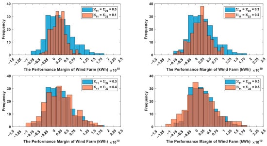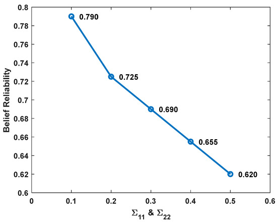 To compare the wind farm belief reliability under different dispersion degrees of wind distribution, we calculated the results under four other dispersion degrees of wind following different two-dimensional normal distribution. Still, the expected value in the two-dimensional normal distribution is , and the covariance matrices are , , and .