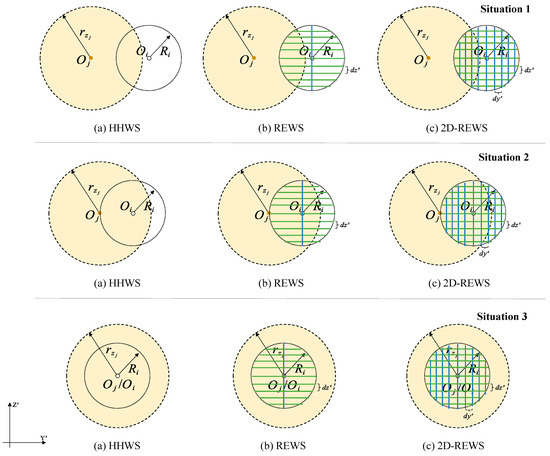 First, to provide a more intuitive explanation of the difference between HHWS, REWS and 2D-REWS, we illustrated three representative situations. Figure 4 and Figure 12 show the three-positional relationship between the upwind turbine wake circle (the yellow one, abbreviated as Cup in the following) and the rotor circle of the downwind turbine (the transparent one, abbreviated as Cdown in the following).