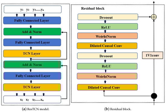 Figure 2a shows the ResTCN model structure. Each of the two network blocks receives data that go through temporal convolutional layers, followed by a fully connected neural network layer and a residual structure. An input sequence X with length T is input into the ResTCN. The temporal convolutional layers consist of a set of convolutional kernels, and . The input sequence X is convolved with convolutional kernel , and bias is added. The first temporal convolutional layer generates output using an activation function, such as ReLU, to introduce nonlinearity. Residual connections add connections to the output of each time convolutional layer through the addition of the input sequence X to the output . This allows information to be jump-connected in the network, helping to solve the gradient vanishing problem.