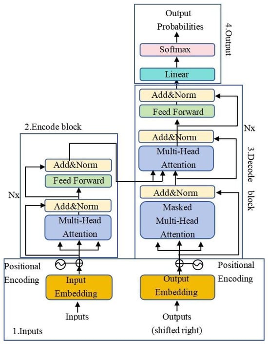 - Transformer Model: To enhance the accuracy of the deep learning model for lithology identification and classification in blind wells, we employed the Transformer model from natural language processing. This model integrates self-attention and attention mechanisms to discern data features within the current sequence, focusing on information from various locations within the input data. Comprising a positional encoding layer, encoder, and decoder, all interconnected through attention mechanisms, the Transformer model is adept at processing sequential data. The encoder and decoder modules are composed of multiple blocks, incorporating a multi-head self-attention mechanism layer and a point feedforward neural network layer, respectively. The input sequences undergo processing through the Transformer encoder, leveraging the self-attention mechanism to extract features and learn sequence element representations. This model effectively addresses the challenges associated with poor classification conducted by conventional machine learning models that stem from the heterogeneous nature of subsurface reservoirs and the nonlinear relationships inherent in logging data. Notably, the model achieves efficient and accurate classification on blind well datasets. Figure 4 provides a visual representation of the Transformer model and illustrates its components, including inputs, the encoder, the decoder, and outputs.