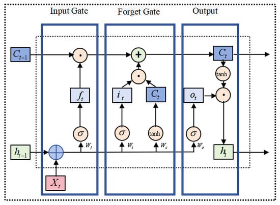 - LSTM layer: The LSTM layer processes the sequence data and captures long-term dependencies, using the output of the transformer encoder as its input. It maintains an internal memory called the cell state, and has forget, input, and output gates to control the updating and use of the cell state. This enables it to selectively remember and forget the information of input sequences, and to better handle long-term dependencies. The structure of LSTM is shown in Figure 5.