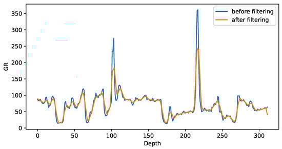 The collected logging data have varying curve lengths and anomalies that require data cleaning. The number of rock samples in the dataset varies, and when the difference is significant, this can affect the results of the lithology prediction. Therefore, data preprocessing is necessary. The logging curve segment was processed using the Savitzky–Golay method introduced in Section 2.3, which involves using a sliding window, selecting a set of data points within the window, and estimating the smoothed value at the center of the window using a least squares polynomial fit. The window is then slid to the next position, and the fitting process is repeated until the entire data series is covered. Here, the outliers were handled by adjusting the size of the window; the larger the window, the better the outliers are handled. However, too large a window can also affect the other data, so it is crucial to use an appropriate window value. The results are shown in Figure 6, which displays the difference graph of the effect of one of the logging curve segments in the dataset before and after the filtering process. The logging curve segment before filtering is blue, while the orange curve shows the shape of the curve after processing. The method effectively removes sharp points on the original curve, resulting in a much smoother curve.