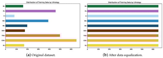 To mitigate the aforementioned issues, we generated a histogram illustrating the distribution of training samples, depicted in Figure 7a. This revealed an imbalance in sample counts across different lithology categories, with PS, WS, FSiS, and CSiS having higher sample counts, and D having significantly fewer samples. To address this imbalance, we employed a sample interpolation method based on genetic algorithms, as outlined in Section 2.4. This method involved augmenting the existing data samples until a more balanced distribution was achieved, thereby increasing the sample counts for certain lithology categories. Following the equalization process, the nine lithologies had approximately 5841 samples. Figure 7b illustrates the histogram, showcasing the distribution of training samples after equalization.