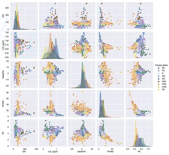 Interrelationships between sample features are crucial in data analysis and machine learning, as they can provide valuable information about the structure, relevance, and importance of the data, and can significantly impact the performance and explanatory power of the model. The interrelationships between the sample features were analyzed, as shown in Figure 8. There were discrete relationships between different samples, such as, GR and ILD _log10, Delta PHI, PHIND, and PE. No obvious signs of multiple covariance between the features were found, which proves that each of the samples is independent. If two features covary strongly, covariance likely exists, and so only one feature should be selected.