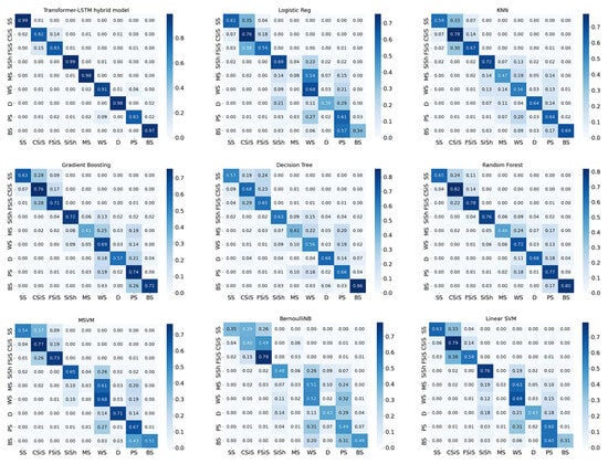 We employed the T-LS model (Section 2.2) for blind well lithology classification. To evaluate our model, we applied a number of machine learning and deep learning models to the same dataset. These eight models included logistic regression (LR), k-nearest neighbors (KNN), RF, decision tree (DT), gradient boosting (GB), linear support vector machine (LSVM), multiclass support vector machine (MSVM), and Bernoulli naive Bayes (BNB) models. The hyperparameter selection of all models is summarized in Table 4. Precision, recall, and -score were employed to evaluate the lithology prediction capabilities of the models, with results as shown in Table 7. Based on these results, the RF and T-LS models demonstrate superior performances in the precision, recall, and -score. The T-LS model outperformed RF across most samples, except for a few rocky samples such as CSiS and FSiS. The overall evaluation value of the T-LS model is approximately 0.88, which surpasses that of the RF model, which is at 0.74.