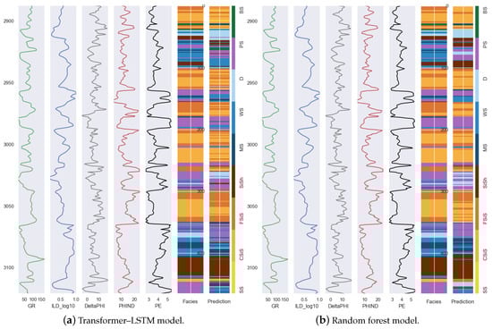 The comparative experimental results underscore the superior classification prediction of the proposed model compared to traditional methods. The lithology of adjacent unlabeled blind wells was predicted using the T-LS and RF models, revealing superior performance of the new model in terms of its generalization ability, thereby partially mitigating the challenges of inaccurate prediction and weak generalization abilities encountered by traditional machine learning and deep learning models in lithology recognition. Our future work will focus on improving the T-LS model by incorporating additional features and refining its architecture, so as to further enhance the lithology prediction accuracy. Additionally, exploring the integration of advanced data augmentation techniques and domain-specific knowledge could enhance the model’s robustness and generalization ability across diverse geological formations.