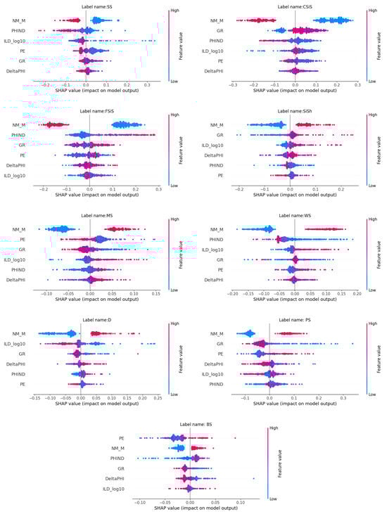 The use of Shapley analysis scatter plots can help researchers understand the extent to which a model contributes to each logging data feature. Figure 13 shows the Shapley analysis scatter plot for the identification of nine lithology types using the T-LS model, where the horizontal coordinates indicate the Shapley values, the vertical coordinates indicate the names of the features, and each point represents a sample instance. The six features selected were GR, ILD_log10, DeltaPHI, PHIND, PE, and NM_M, and the names of the nine lithology types are shown in Table 2. A positive Shapley value means that the feature contributes more positively to the prediction results, while a negative Shapley value means that it contributes more negatively. The darker the color, the larger the value of the feature. The lighter the color, the smaller the value of the feature. By observing the change in color coding, the degree of influence of different feature values on the prediction results can be understood. Among all the features, NM_M, i.e., terrestrial or marine stratigraphy, has the greatest influence on lithology prediction, while other features have different influences on lithology prediction for different categories. For example, for SS formations, PHIND and DeltaPHI have a greater impact, while for CSIS formations, GR and PHIND have a greater impact, and DeltaPHI has a smaller impact. In the multi-sample lithology classification prediction task undertaken as part of the comprehensive analysis, the more information and feature values contained in the logging data, the better the classification prediction accuracy. Multi-information fusion logging data analysis can provide a better understanding of the nature of subsurface rocks and fluids, assess the capacity and recoverable reserves of oil and gas reservoirs, optimize drilling and production decisions, and reduce exploration and development risks by combining data from multiple logging tools. In practical applications, factors such as logging tool characteristics, data quality, calibration, and alignment must be considered to ensure the accuracy and reliability of fusion analysis.